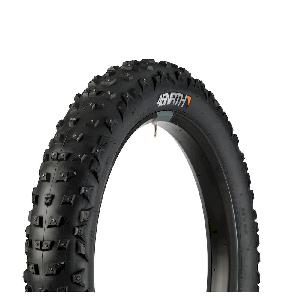From loose snow to icy freeze-thaw and everything in between, the 45NRTH Wrathchild Fat Tire craves the best and worst winter conditions. Deep center lugs aggressively claw into unconsolidated snow for extreme acceleration and braking traction. Super tall side lugs dig into loose snow to provide predictable and confident cornering. Encounter sheer ice on your ride and Wrathchild's concave studs tear into the surface. Let Wrathchild bring out your inner child and go carve up some local trails.