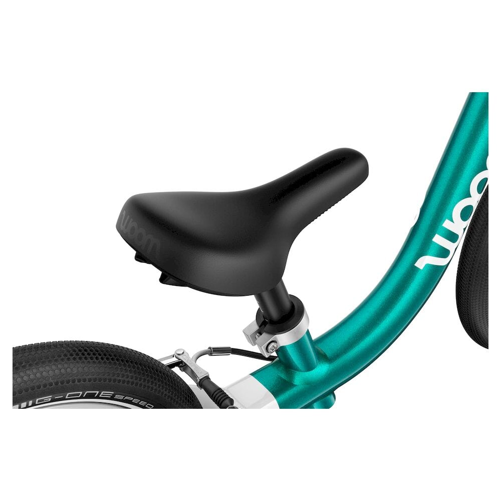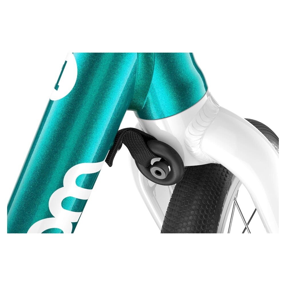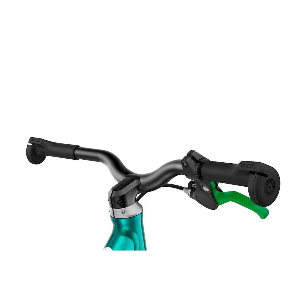 Smale håndtak tilpasset små hender, en lett tilgjengelig mini V-brems med grønn bremsehendel og en buet sadel som forhindrer at barnet sklir av – hver detalj er designet for å gi en trygg og komfortabel sykkelopplevelse.