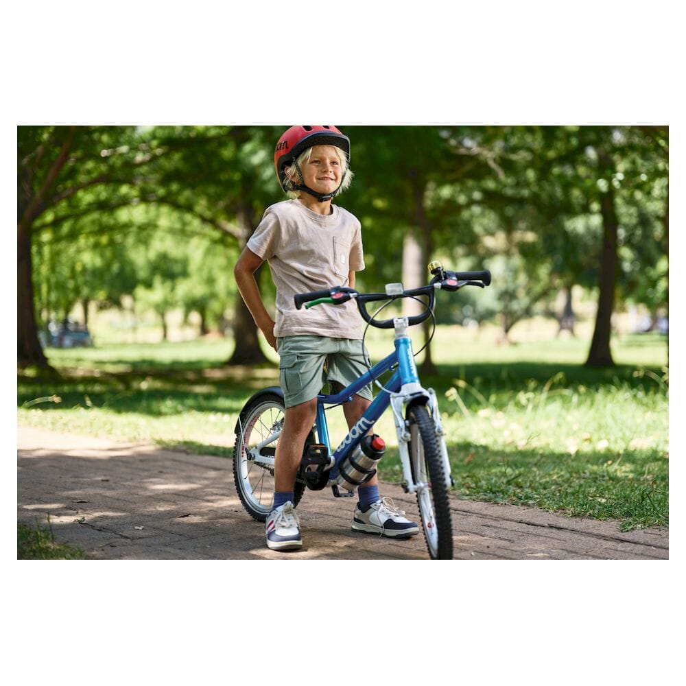 Den superlette aluminiumsrammen er hjertet i sykkelen. Den aldersbestemte geometrien med lav innstigning og oppreist sittestilling gjør det mulig for barnet ditt å komme seg på og av sykkelen trygt.