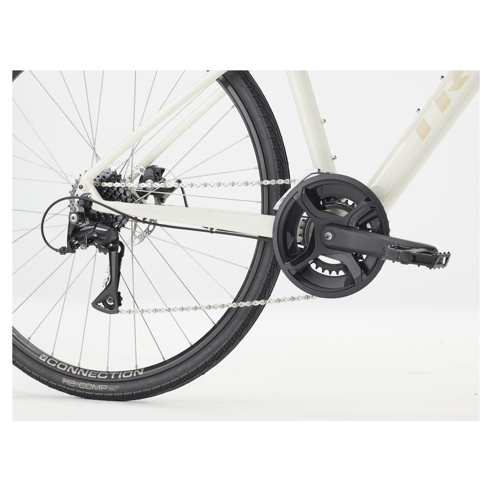 Alpha Gold aluminiumramme gir god holdbarhet og komfort. Shimano EF500 girsystem med 8-delt girvelger og 2-delt krankgir gir deg et bredt girutvalg. Mekaniske skivebremser gir pålitelig stoppkraft under alle forhold. Hjul og dekk fra Bontrager gir sikker rulling på byens veier.