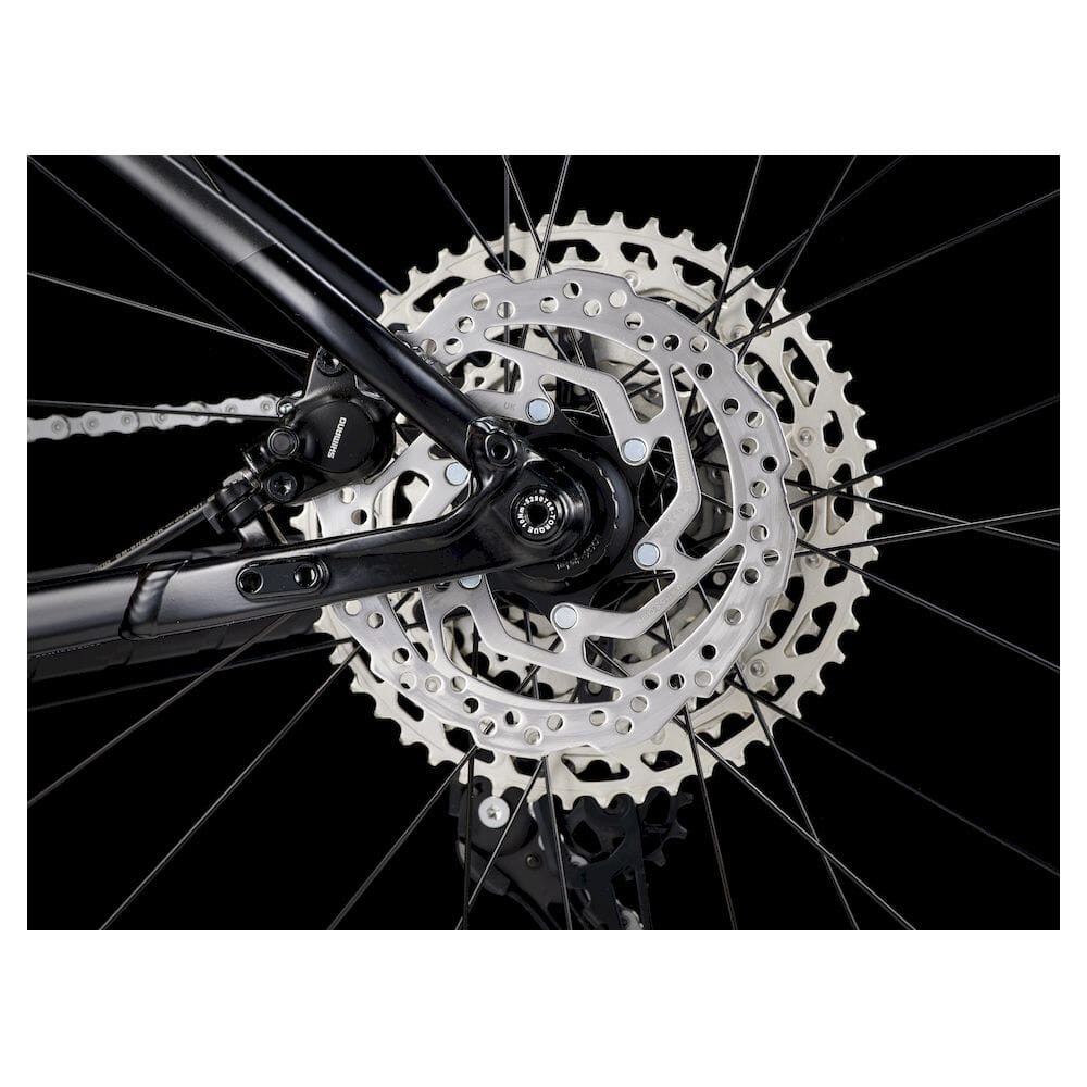 Hydrauliske Shimano MT200 skivebremser med 160–180 mm skiver.